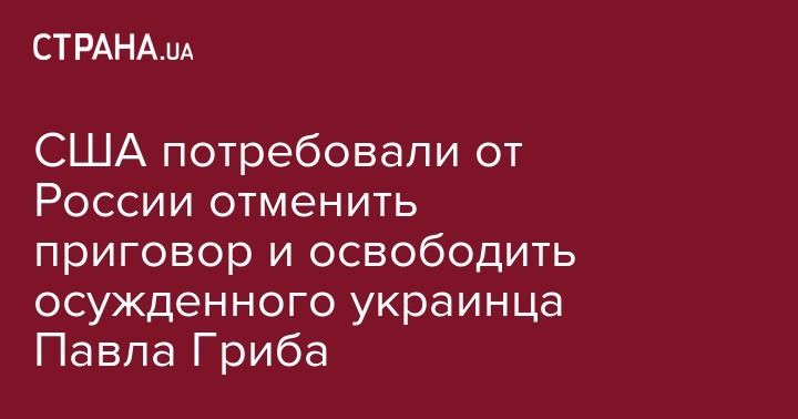 США призвали Россию освободить гражданина Украины Павла Гриба, которого российский суд приговорил к 6 годам колонии. Об этом сообщил заместитель руководителя пресс-службы Госдепартамента США Роберт Палладино на своей странице в Twitter.