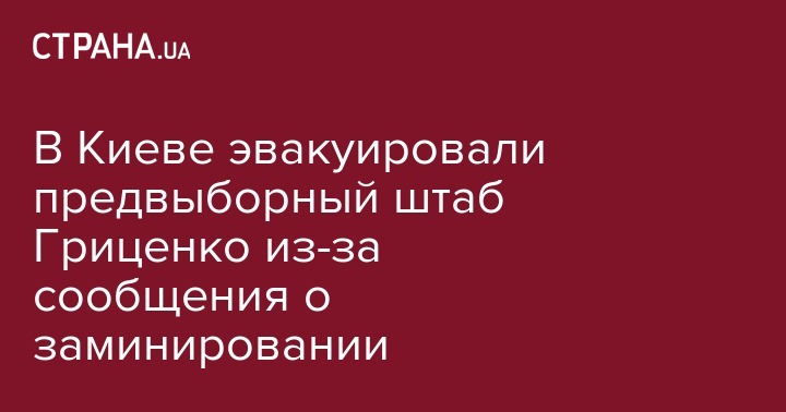 Лидер партии "Гражданская позиция", кандидат в президенты Украины Анатолий Гриценко сообщил, что около 14:00 вторника получил информацию об эвакуации полицией Киева людей из здания, где расположен его предвыборный штаб из-за поступившего к правоохранителям анонимного сообщения о минировании. Об этом он написал на своей странице в соцсети.