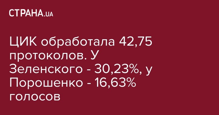 У Владимира Зеленского на эту минуту 30,23%, а у Петра Порошенко - 16,63% голосов сообщает пресс-служба ЦИК.