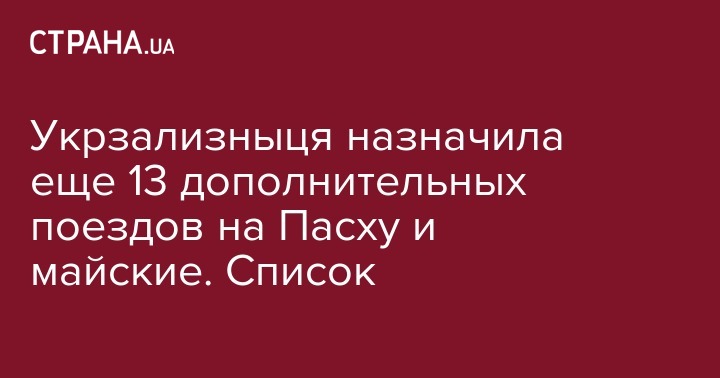 "Укрзализныця" по состоянию на пятницу, 5 апреля, назначила еще 13 дополнительных поездов, дополнительные рейсы на пять графиковых поездов на пасхальные и майские праздники. Об этом информирует пресс-служба УЗ.