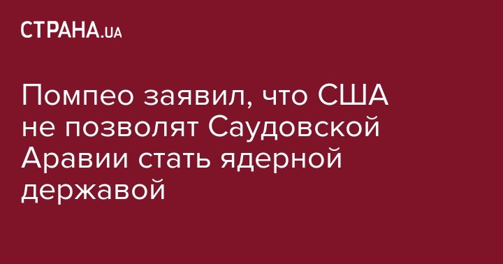 "Мы никогда этого не допустим. Мы никогда не допустим этого где-либо в мире. Президент понимает опасность распространения. Мы никогда не выпишем саудитам чек и не передадим им технологии, чтобы они угрожали Израилю и Соединенным Штатам ядерным оружием, никогда", - сказал Помпео в пятницу, отвечая на вопрос журналиста телеканала CBS о том, позволят ли США Саудовской Аравии стать ядерной державой. Его цитирует Интерфакс-Украина.