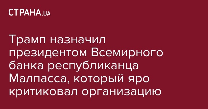 Президент САШ Дональд Трамп назначил на должность президента Всемирного банка члена республиканской партии США и замминистра финансов по иностранным делам Дэвида Малпасса, который критиковал организацию за негибкость и навязчивость. Об этом сообщает BBC.