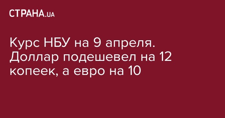 Национальный банк Украины (НБУ) установил курс основных валют по отношению к гривне на вторник, 9 апреля. По сравнению с предыдущим банковским днем доллар подешевел на 12 копеек. Об этом свидетельствует информация, размещенная на сайте регулятора.