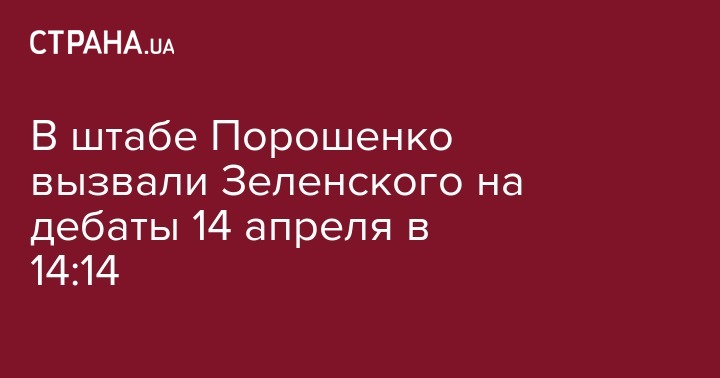 В штабе действующего президента Петра Порошенко заявили, что их кандидат приглашает своего оппонента во втором туре голосования Владимира Зеленского на дебаты 14 апреля в 14:14 на НСК "Олимпийский". Об этом со ссылкой на спикера избирательного штаба Порошенко Олега Медведева пишет "Украинская Правда".