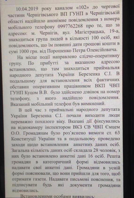 В среду, 10 апреля, в приемной нардепа Сергея Березенко в Чернигове представители штаба президента Петра Порошенко раздавали людям по 1000 гривен. Об этом сообщает на своей странице пользователь Facebook Сергей Головня.