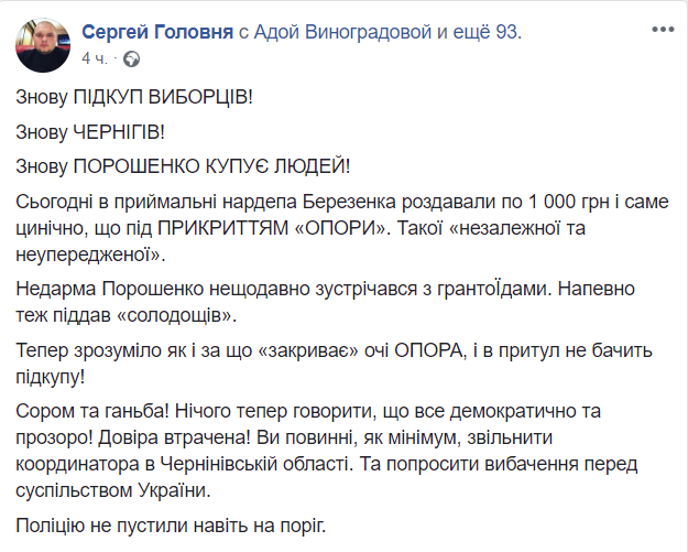 "Недаром Порошенко недавно встречался с грантоедами. Наверное тоже подверг "сладостям". Теперь понятно как и за что «закрывает» глаза ОПОРА, и в упор не видит подкупа! Стыд и позор! Ничего теперь говорить, что все демократично и прозрачно! Доверие потеряно! Вы должны, как минимум, освободить координатора в Черниговской области. И попросить прощения перед обществом Украины", - написал активист.