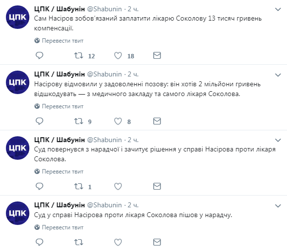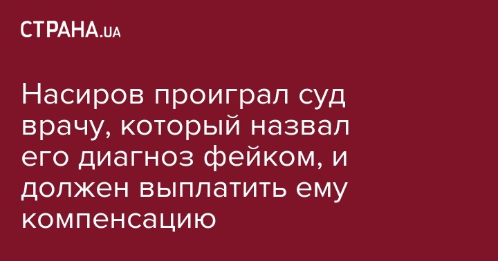 Отметим, что Роман Насиров требовал у Соколова компенсацию размером 1 миллион гривен за оглашение в суде фактов о состоянии его здоровья. Также он просил суд признать обследования и показания в суде Соколова по его делу незаконными.