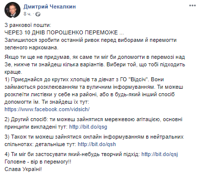 Шоумен Дмитрий Чекалкин написал, что на электронную почту получил сообщение от "Видсичи" с призывом "сделать последний рывок перед выборами и победить зеленого наркомана" и предложением выбрать один из вариантов, как он может помочь "в победе над Зе".