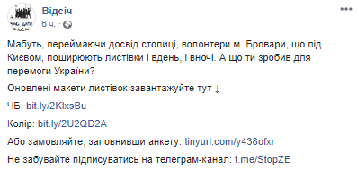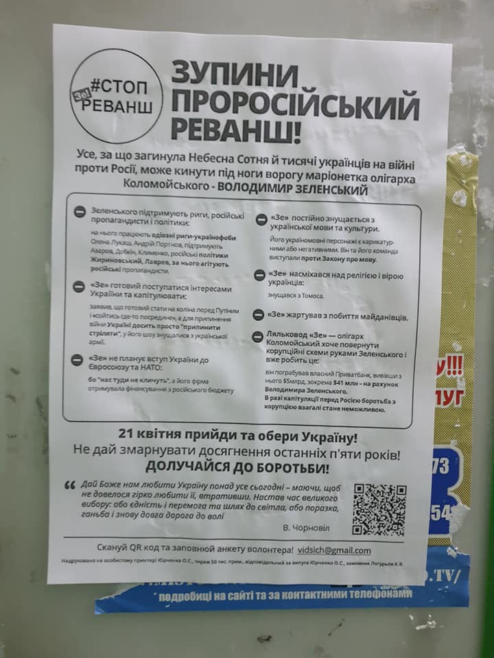 В свою очередь активисты организация "Видсич" на своей странице в соцсети заявляют, что они распространяют в Киеве и области листовки против Зеленского с надписью "Останови пророссийский реванш".