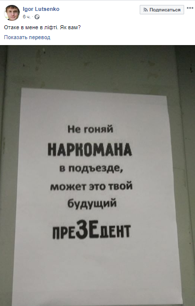 В частности, нардеп от "Батькивщины" Игорь Луценко увидел в лифте своего подъезда распечатанную на принтере листовку без выходных данных и с текстом : " Не гоняй наркомана в подъезде, может это твой будущий преЗЕдент".