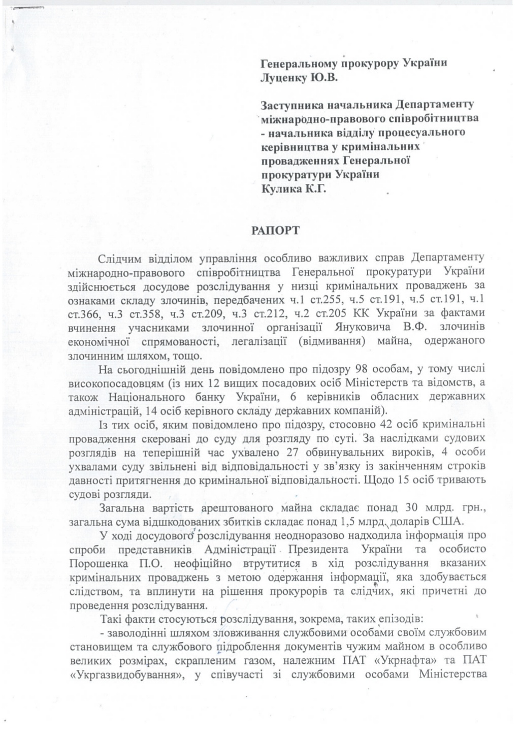 В рапорте напоминается о завершении расследования в ряде уголовных производств по признакам состава преступлений, предусмотренных ч.1 ст. 255, ч. 5 ст. 191 ч. 1 ст. 366, ч. 3 ст.358, ч. 3 ст.209, ч. 3 ст. 212, ч.2 ст. 205 Уголовного кодекса Украины по фактам совершения участниками преступной организации экс-президента Украины Виктора Януковича преступлений экономической направленности, легализации (отмывания) имущества, полученного преступным путем.