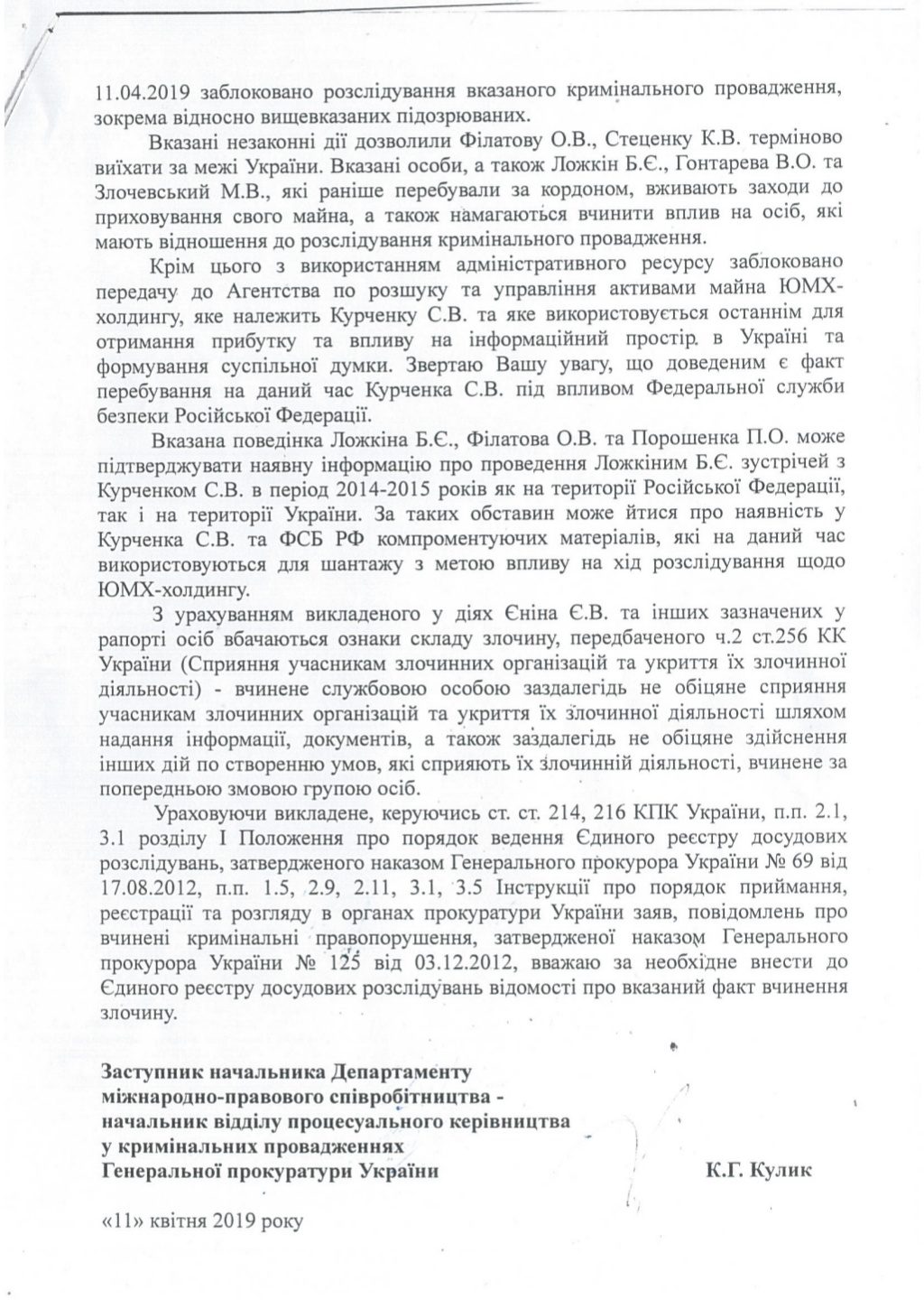 Заместитель главы департамента международно-правового сотрудничества Генпрокуратуры Украины Константин Кулик обвинил лично президента Украины Петра Порошенко, представителей Администрации президента, некоторых народных депутатов от БПП и руководство ГПУ во вмешательстве в расследование так называемого дела Курченко, в котором фигурирует окружения действующего главы государства. Об этом речь идет идет в его рапорте от 11 апреля генпрокурору Украины Юрию Луценко, который Кулик зачитал на пресс-конференции, передает ТСН.