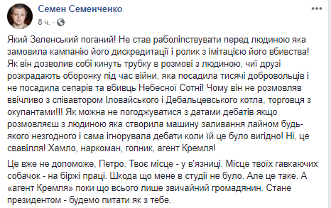 "Какой Зеленский плохой! Не стал раболепствовать перед человеком, который заказала кампанию его дискредитации и ролик с имитацией его убийства! Как он позволил себе бросить трубку в разговоре с человеком, чьи друзья разворовывают оборонку во время войны, посадили тысячи добровольцев и не посадили сепаров и убийц Небесной Сотни! Почему он не разговаривал вежливо с соавтором Иловайского и Дебальцевского котла, торговца с оккупантами!!! Как можно не соглашаться с датами дебатов, если разговариваешь с человеком, который создал машину заливки дерьмом любого несогласного и сам игнорировала дебаты, когда ему это было выгодно! Нет, это беспредел! Хамло, наркоман, гопник, агент Кремля!