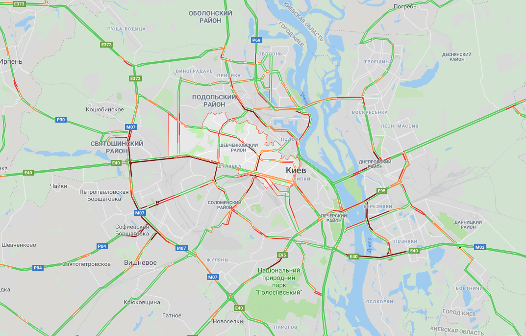 На несколько километров пробка растянулась по проспекту Победы между станциями метро "Житомирская" и "Шулявская" и на въезде в Киев по проспекту Курбаса и Голосеевскому проспекту. Движение осложнено в центральной части города, на Печерске, Лукьяновке и Подоле.