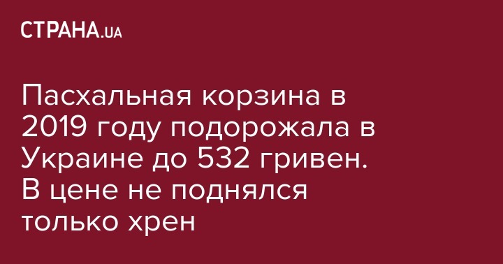 Стоимость пасхальной корзины для украинцев в 2019 году выросла на 26 гривен по сравнению с 2018 годом с 506 гривен и составит около 532 гривни. Об этом сообщает пресс-служба Института аграрной экономики.
