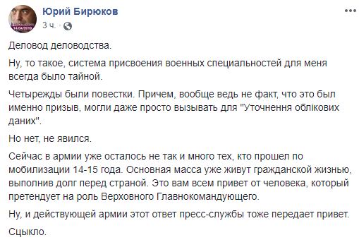 "Четырежды были повестки. Причем, вообще ведь не факт, что это был именно призыв, могли даже просто вызывать для "Уточнення облікових даних". Но нет, не явился. Сейчас в армии уже осталось не так и много тех, кто прошел по мобилизации 14-15 года. Основная масса уже живут гражданской жизнью, выполнив долг перед страной. Это вам всем привет от человека, который претендует на роль Верховного Главнокомандующего", - написал он.
