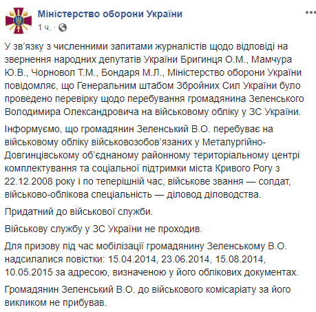 "Гражданин Зеленский В.А. находится на воинском учете военнообязанных в Металлургическо-Долгинцевском объединенном районном территориальном центре комплектования и социальной поддержки Кривого Рога с 22.12.2008 года и по настоящее время, воинское звание - солдат, военно-учетная специальность - делопроизводитель делопроизводства. Годен к военной службе. Военную службу в ВС Украины не проходил", - говорится в сообщении.