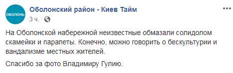 "На Оболонской набережной неизвестные обмазали солидолом скамейки и парапеты. Конечно, можно говорить о бескультурье и вандализме местных жителей", - говорится в нем.