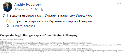 "Укртрансгаз" открыл экспорт газа из Украины в направлении Венгрии", - написал Коболев.