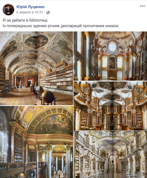 А 6 апреля генпрокурор запостил фотографии красивых библиотек, предложив провести дебаты в таком месте.