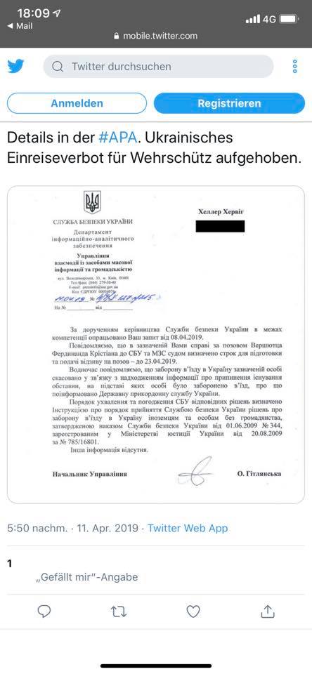 Служба безопасности Украины прислала Вершютцу письмо о том, что ему можно вернуться в Украину. Как там сказано, запрет на въезд "отменен в связи с поступлением информации о прекращении существования обстоятельств, на основании которых лицу был запрещен въезд, о чем проинформирована Государственная пограничная служба Украины".