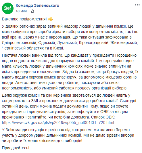 По сообщению представителей команды Зеленского, недостаток людей возник от того, что кандидат в президенты Порошенко подал недостаточное число для формирования комиссий. "Малое количество людей в участковых комиссиях может повлиять на качество проведения голосования.... если не хватает людей, их должны подать окружные комиссии собственноручно, с помощью местных органов власти. Но последние тоже этого не делают, показывая или свою несостоятельность, или умышленный саботаж процесса организации выборов", - отмечают в Зе-команде