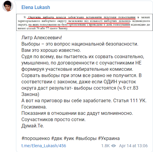 "Выборы – это вопрос национальной безопасности. Вам это хорошо известно. Судя по всему, вы пытаетесь их сорвать сознательно, умышленно, по договоренности с соучастниками НЕ формируя участковые избирательные комиссии. Сорвать выборы при этом все равно не получится. В соответствии с законом, даже если ОДИН участок округа даст результат- выборы состоятся (ч.9 ст.83 Закона). А вот на приговор вы себе заработаете. Статья 111 УК. Госизмена. Показания в отношении вас дадут молниеносно. Соучастников просто сотни", - заявила экс-министр юстиции Украины Елена Лукаш в Telegram-канале.