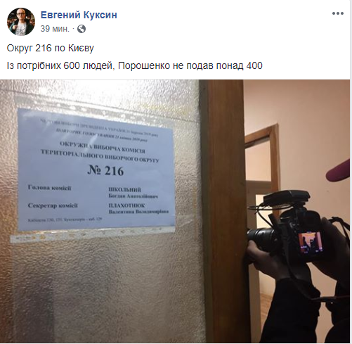 Журналист Евгений Куксин также подтверждает обозначенную проблему: "Округ 216 по Киеву. Из необходимых 600 человек, Порошенко не подал больше 400", - написал он на своей странице в Facebook.