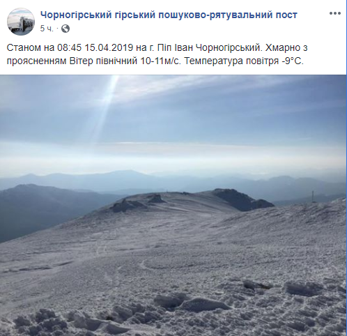 Черногорский горный поисково-спасательный пост также сообщает, что по состоянию на утро 15 апреля мороз в Карпатах достигает -9 градусов.