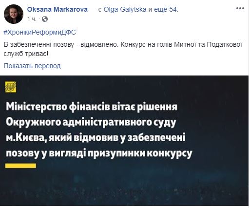 Окружной админсуд Киева 12 апреля 2019 года отказал экс-главе Государственной фискальной службы (ГФС) Роману Насирову в ходатайстве о приостановке конкурсов на должности глав Государственной налоговой службы (ГНС) и Государственной таможенной службы (ГТС) для обеспечения его иска к Кабинету министров. Об этом министр финансов Оксана Маркарова написала на своей странице в Facebook в понедельник.