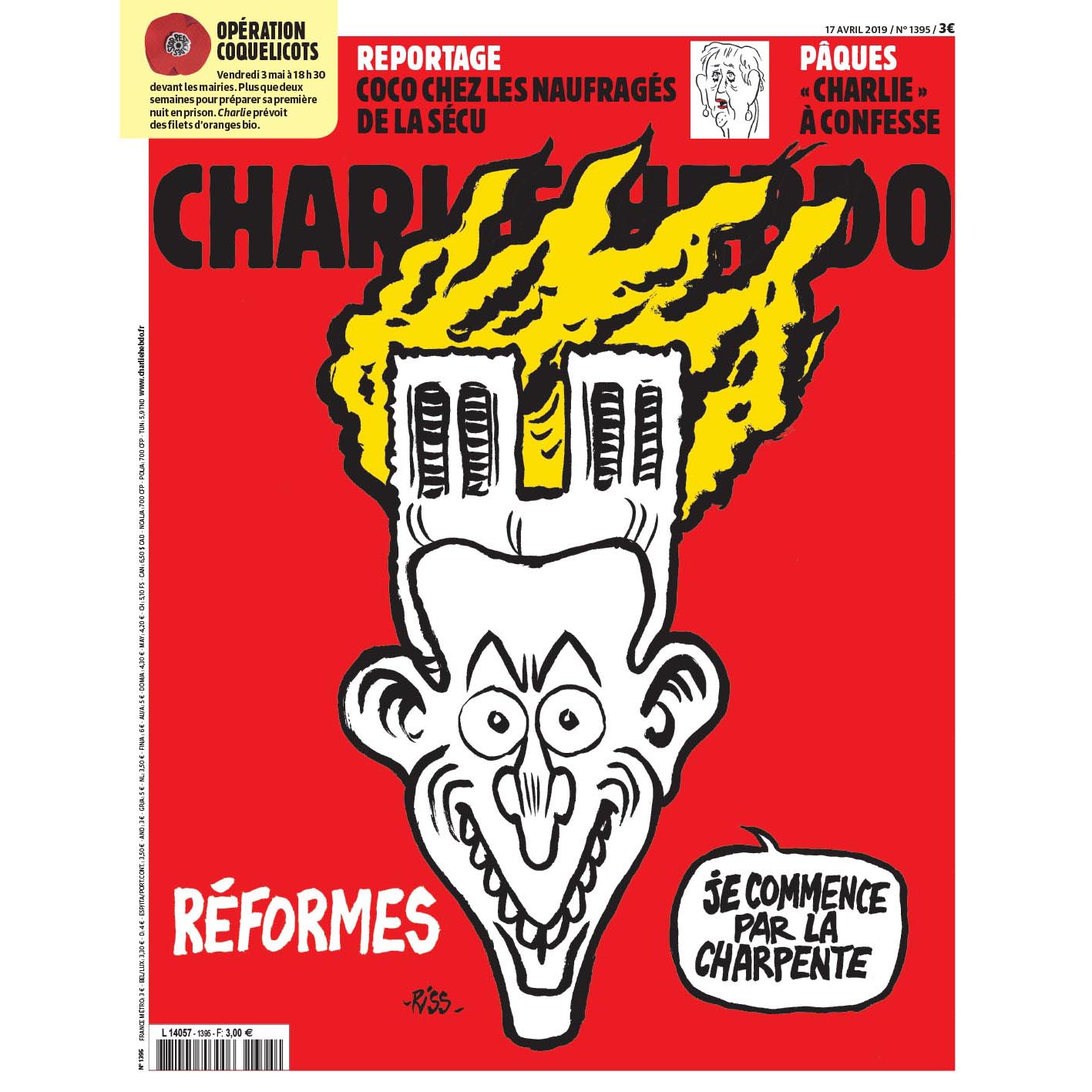 На обложке написано "реформы" и изображен президент Франции Эммануэль Макрон, у которого на голове горит собор. Он говорит: "Я начну с плотницких работ".