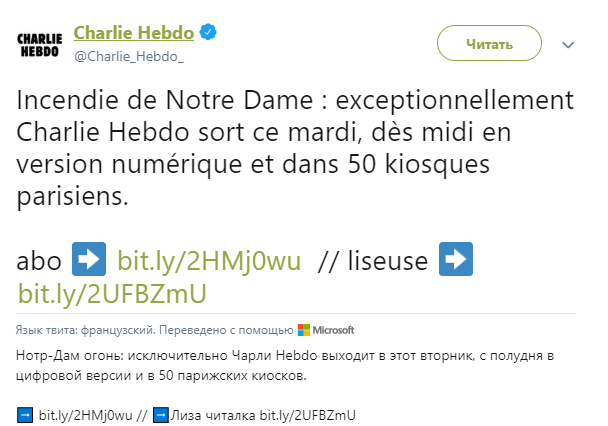 Во вторник, 16 апреля, номер французского сатирического еженедельника Charlie Hebdo выйдет с обложкой, на которой будет размещена карикатура на пожар в Соборе Парижской Богоматери. Об этом еженедельник сообщил в своем Twitter.