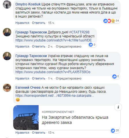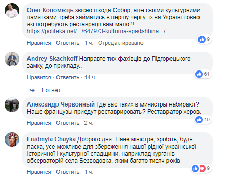 Пользователи также забросали министра целым огромным списком неотреставрированных объектов культурного наследия Украины: это и старинный цех пивзавода в Ивано-Франковске, и Червоноградский замок в Тернопольской области, и Невицкий замок, и многие другие.
