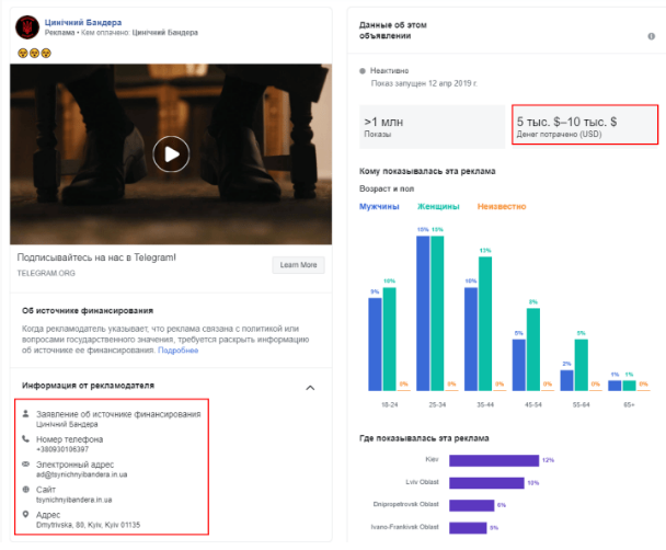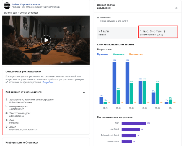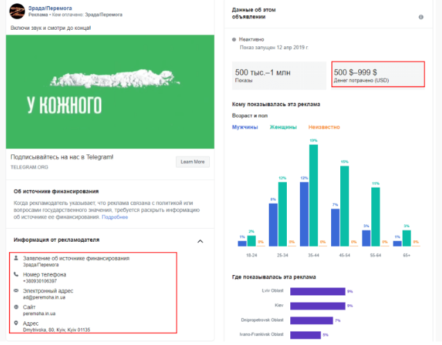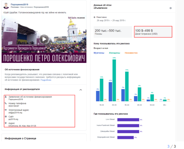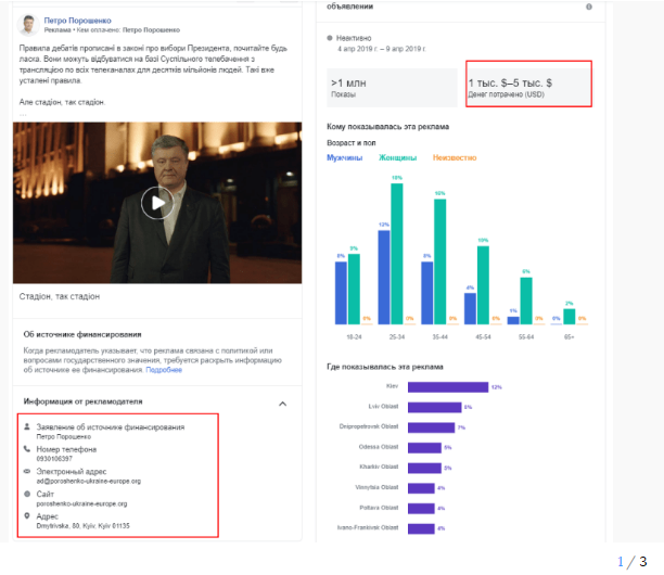 Благодаря тому, что Facebook раскрыл данные о заказчиках политической рекламы в соцсети, журналисту Евгению Спирину удалось узнать, что рекламные аккаунты, с которых запускалось продвижение на официальной странице Порошенко и в пабликах, публикующих антирекламу Владимира Зеленского и других соперников президента в первом туре, привязаны к одному и тому же номеру телефона. Он принадлежит сотруднице украинского цифрового агентства Postmen.