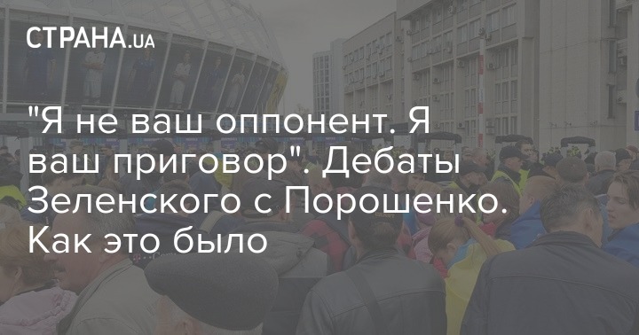 19 апреля НСК "Олимпийский" в Киеве принял дебаты кандидатов в президенты - Петра Порошенко и Владимира Зеленского, дату которых согласовывали с 7 апреля. Дебаты начались в 19:00. У кандидатов было по 5 минут на вступительную речь. Далее они по очереди задавали и отвечали на вопросы друг друга. Это заняло час.
