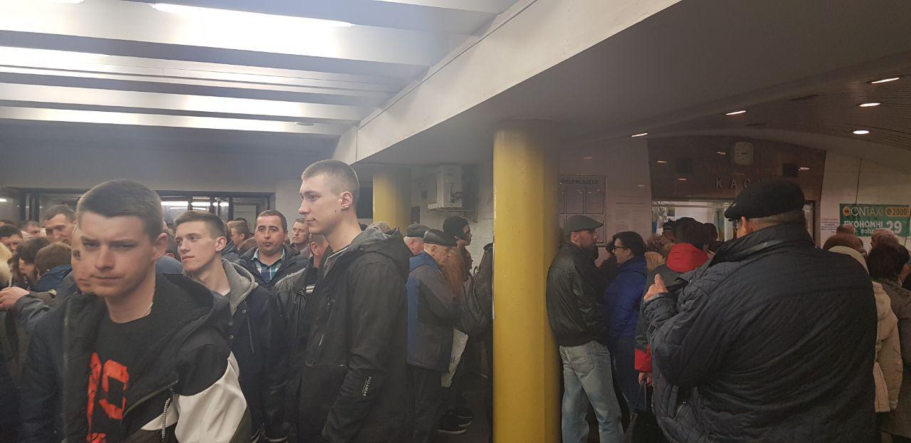15:50 На метро Житомирская большая очередь людей. Они заходят организованными толпами, у каждой толпы есть куратор, который с карточкой становится вначале турникета и проводит свою часть людей. Затем люди организовано заходят в вагоны. В большей степени люди пенсионного возраста, но также есть молодежь. Все вышли на Майдане.