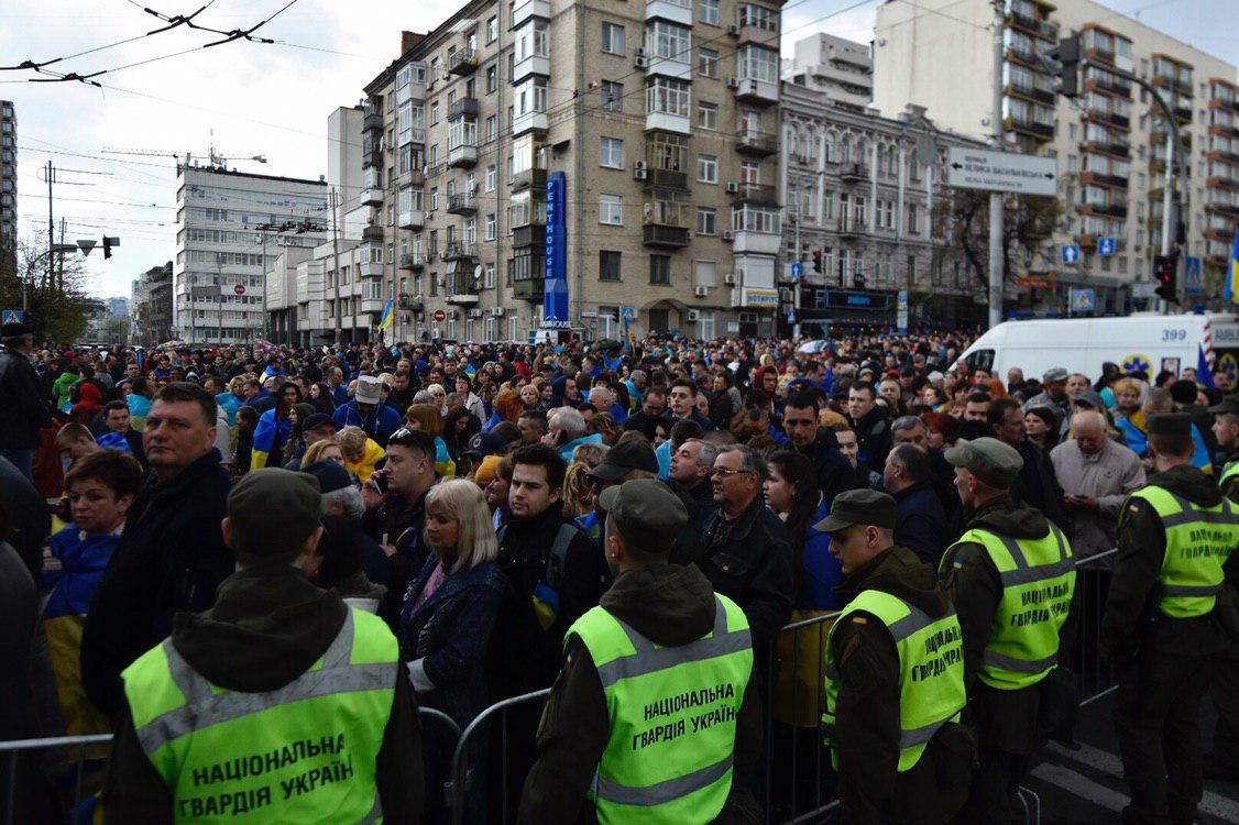 15:07 Порошенко заявил, что колонна с Майдана пойдет на площадь к стадиону и что с 16:00 начнут пускать на стадион. "Не стоит рисковать и экспериментировать с президентом Зеленским. 21 апреля - не повод для экспериментов и шуток", - говорит он. Уговаривает, что влить свежую кровь можно на парламентских выборах осенью. Там риска меньше.