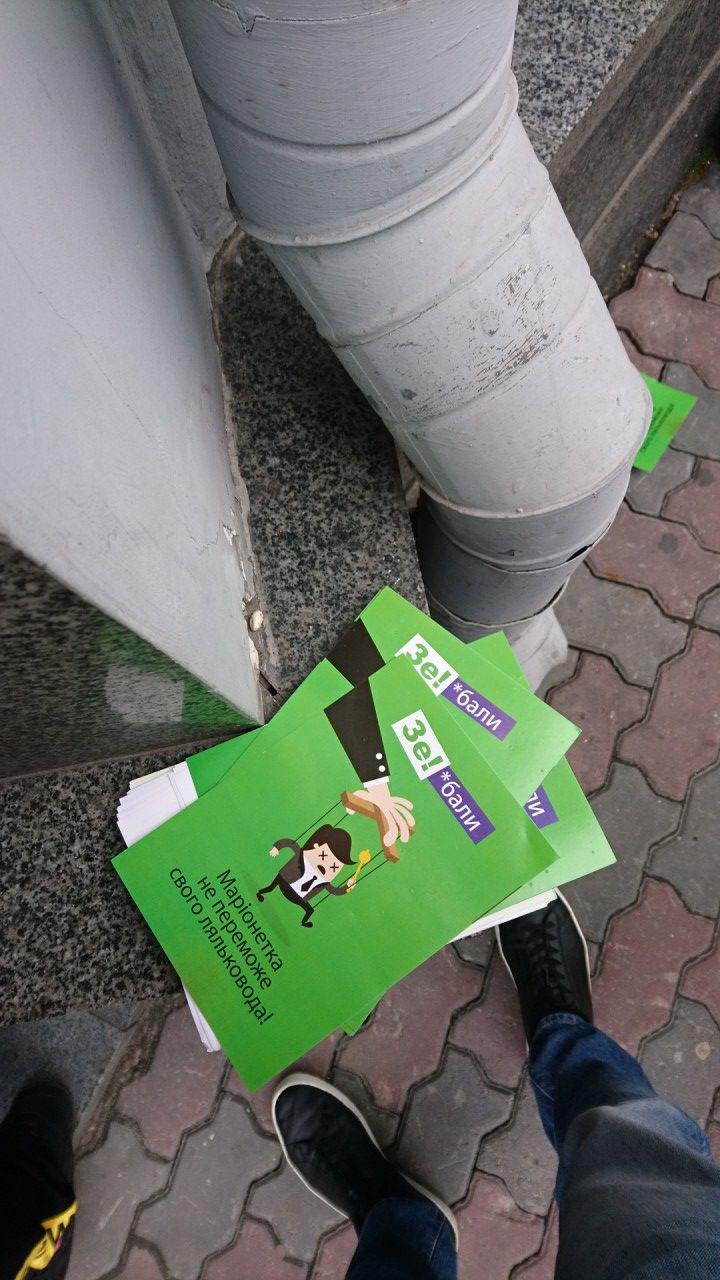 16:18 Вот такие листовки принесли к стадиону сторонники Порошенко. Официально любая символика, которая соотносится с любым из кандидатов, на стадионе запрещена.
