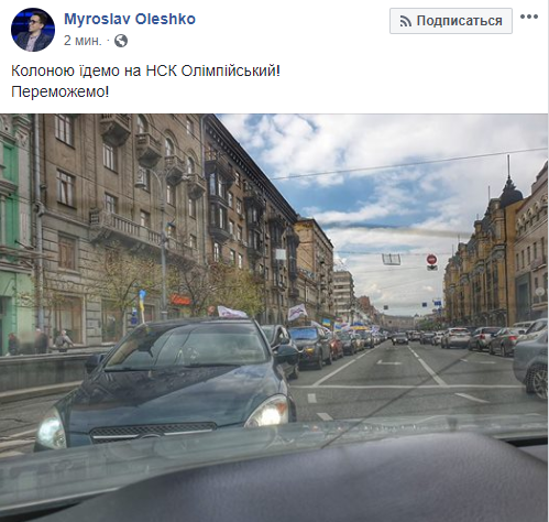 15:17 На "Олимпийский" едет колонна машин с символикой Порошенко. Об этом написал пропрезидентский блогер Мирослав Олешко.
