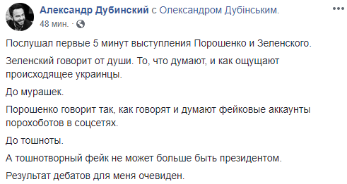 Порошенко говорит так, как говорят и думают фейковые аккаунты порохоботов в соцсетях. До тошноты. А тошнотворный фейк не может больше быть президентом. Результат дебатов для меня очевиден", - написал журналист Александр Дубинский.