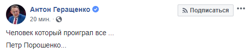 "Человек который проиграл все ... Петр Порошенко..." - написал нардеп Антон Геращенко.