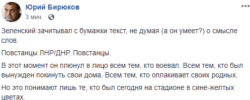 "Зеленский зачитывал с бумажки текст, не думая (а он умеет?) о смысле слов. Повстанцы ЛНР/ДНР. Повстанцы.