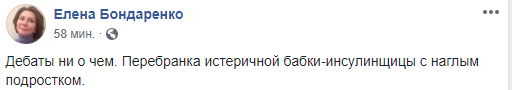 "Дебаты ни о чем. Перебранка истеричной бабки-инсулинщицы с наглым подростком", - написала экс-депутат Елена Бондаренко.