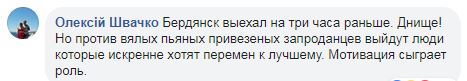 "Бердянск выехал на три часа раньше. Днище! Но против вялых пьяных привезенных запроданцев выйдут люди которые искренне хотят перемен к лучшему. Мотивация сыграет роль", - написал Алексей Швачко.