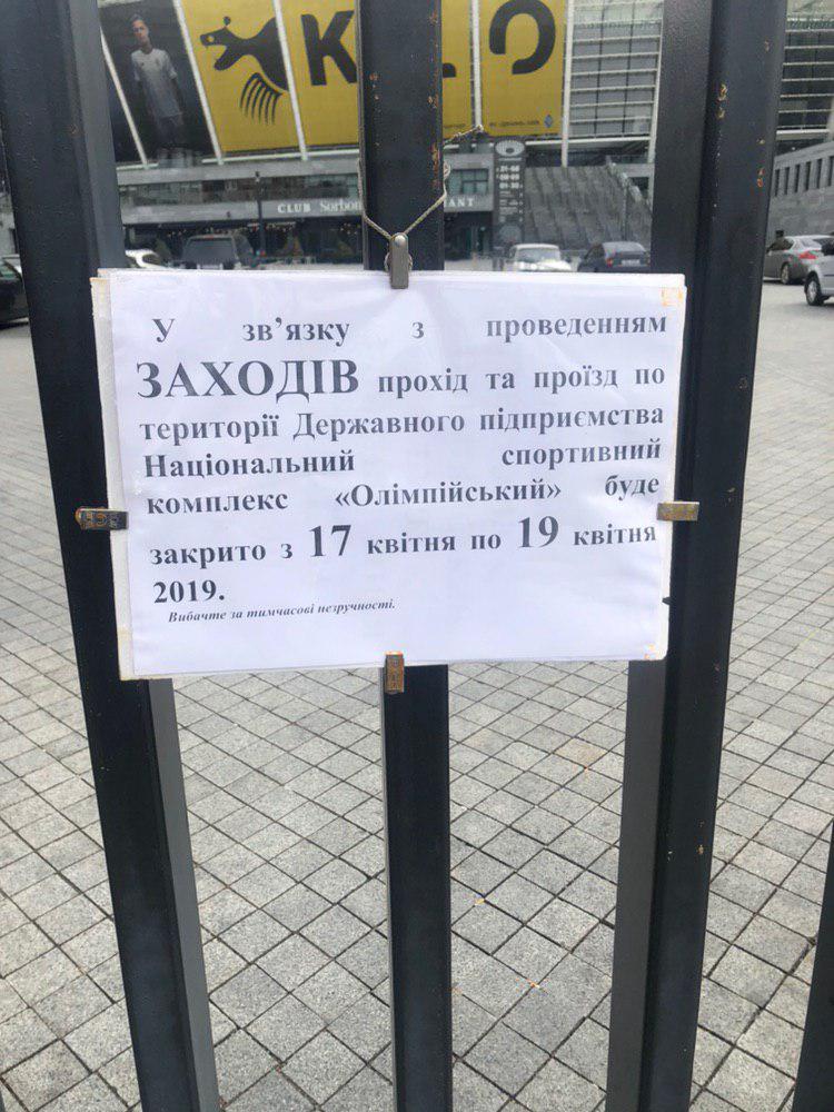 На НСК "Олимпийский" на три дня закрыли проход и проезд к территории вокруг стадиона из-за "мероприятий" - то есть дебатов кандидатов в президенты Владимира Зеленского и Петра Порошенко.