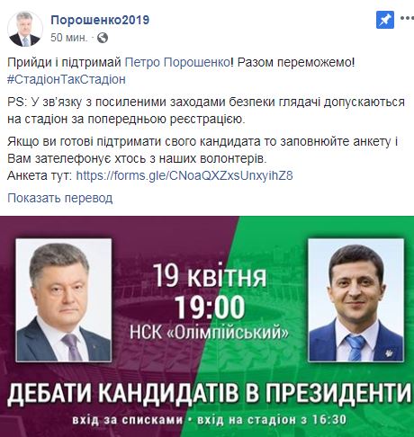 От штаба Порошенко. На Facebook странице штаба Петра Порошенко сообщили, что вход зрителей будет по спискам с 16:30 в связи с "усиленными мерами безопасности". Для сторонников Порошенко из регионов обещают организовать подвоз автобусами. Зарегистрироваться можно, заполнив анкету. После этого должны перезвонить волонтеры.