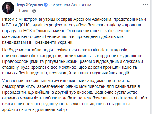 Министр молодежи и спорта Игорь Жданов сообщил о том, что уже прошло совещание вместе с министром внутренних дел Арсеном Аваковым, представителями МВД и ГосЧс, а также администрацией и службой безопасности стадиона. Основным вопросом на нем было обеспечение максимального уровня безопасности при проведении дебатов между кандидатами в президенты.