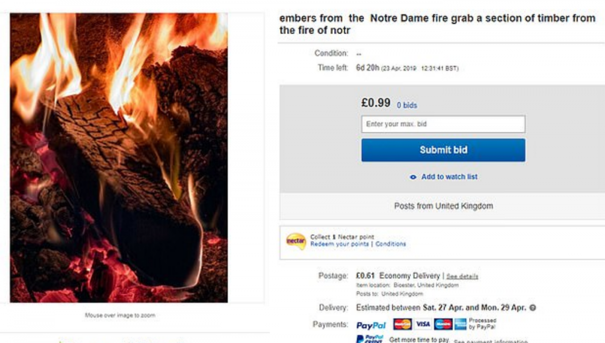 После крупного пожара в Соборе Парижской Богоматери на сайте интернет-аукциона eBay появились объявления, в которых предлагали купить части Нотр-Дама, вплоть до углей, оставшихся от сгоревших элементов собора. Об этом сообщает Daily Mail