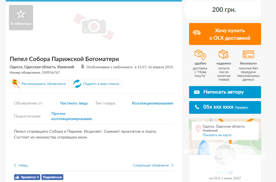 В сети появляются скриншоты, на которых изображено, что пепел Собора продается даже в Одессе. Отметим, что редакции "Страны" не удалось проверить подлинность данных скриншотов. Вполне вероятно, что сайт OLX снял эти объявления.