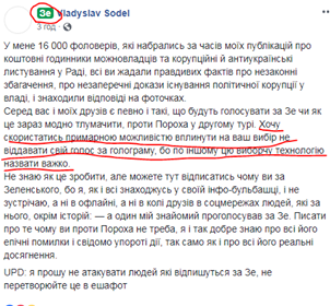 Несмотря на это, он является одновременно и "порохоботом", и сторонником Владимира Зеленского (в заблокированном аккаунте) по версии программы "Кто твой президент".